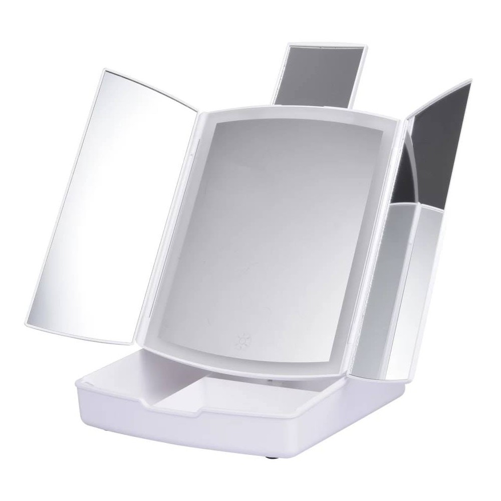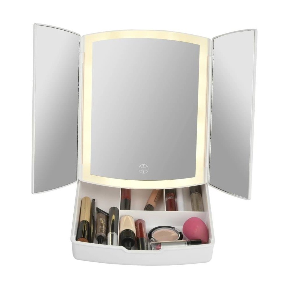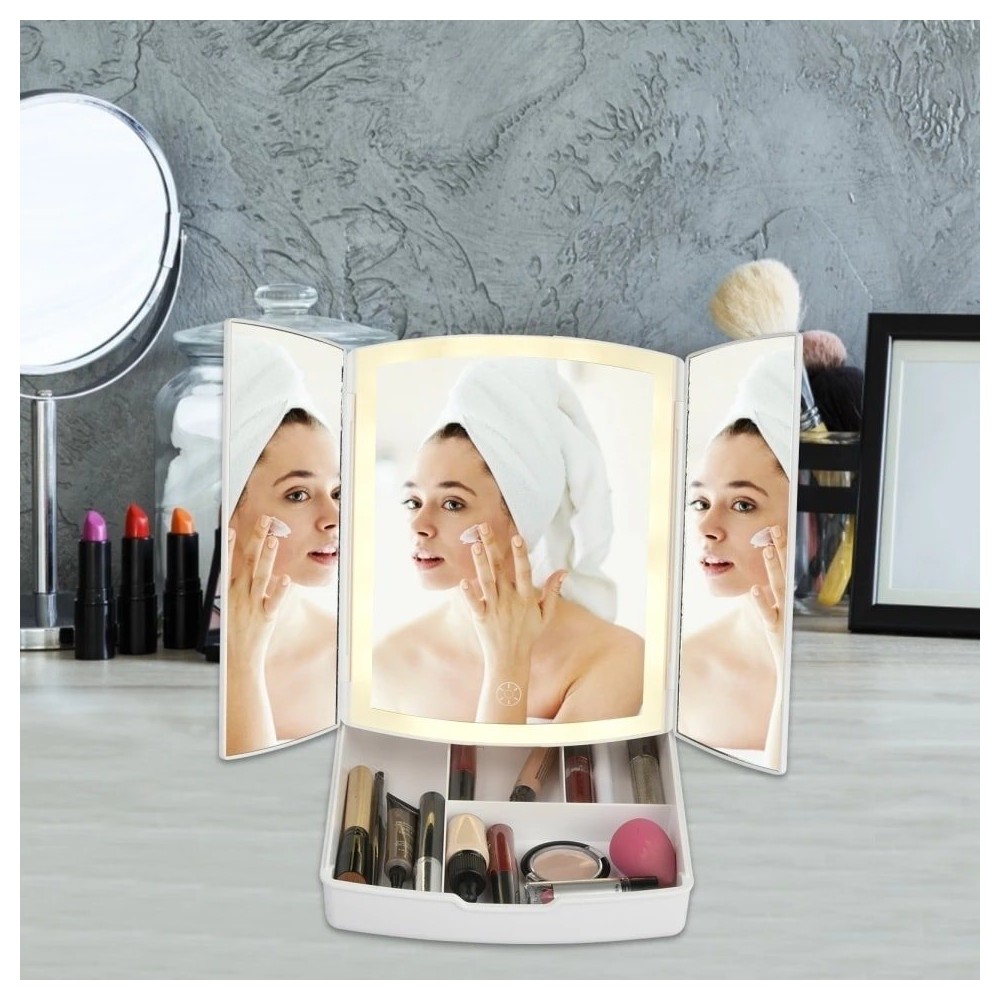 Καθρέφτης μακιγιάζ με πορτάκια καθρέφτες και συρτάρι οργάνωσης καλλυντικών.