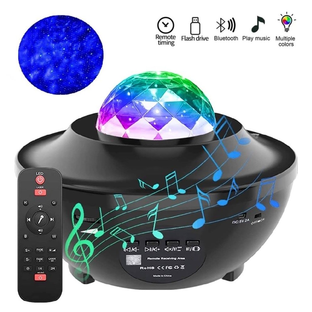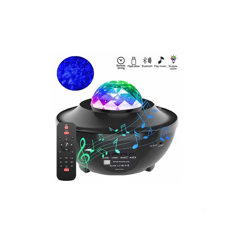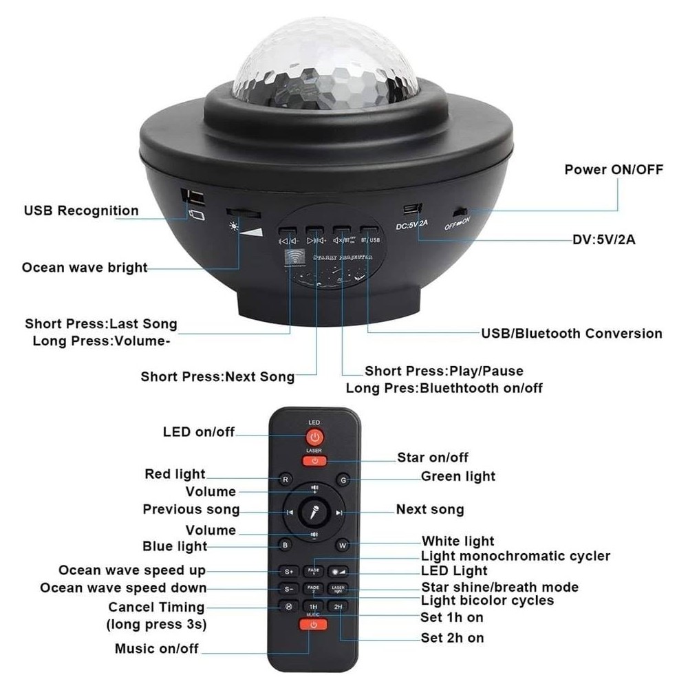 Δεκάδες συνδυασμοί χρωμάτων και ποικιλία λειτουργιών. Σε κάνει να νιώθεις σαν να ξαπλώνεις στον ωκεανό, κάτω από τα αστέρια, αναπτύσσοντας την παιδική φαντασία. Το τηλεχειριστήριο μπορεί να ελέγξει την αναπαραγωγή μουσικής, τα χρώματα φόντου LED, Starry / Galaxy. Ρυθμίστε τη φωτεινότητα, την ταχύτητα αλλαγής, ενεργοποιήστε / απενεργοποιήστε ελεύθερα τη λάμπα ή τη μουσική. Η λειτουργία ενεργοποίησης ήχου επιτρέπει την προβολή ή την αλλαγή της προβολής ανάλογα με το ρυθμό της μουσικής.
