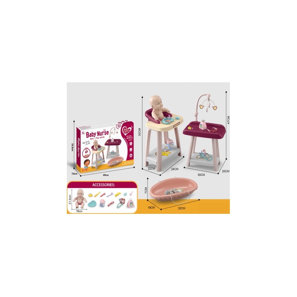 Πλήρες σετ φροντίδας μωρού με κούκλα, καρεκλάκι φαγητού, αλαξιέρα και καλάθι-κρεβατάκι. Περιλαμβάνει όλα τα απαραίτητα αξεσουάρ για την ολοκληρωμένη φροντίδα και την περιποίηση του μωρού σου!